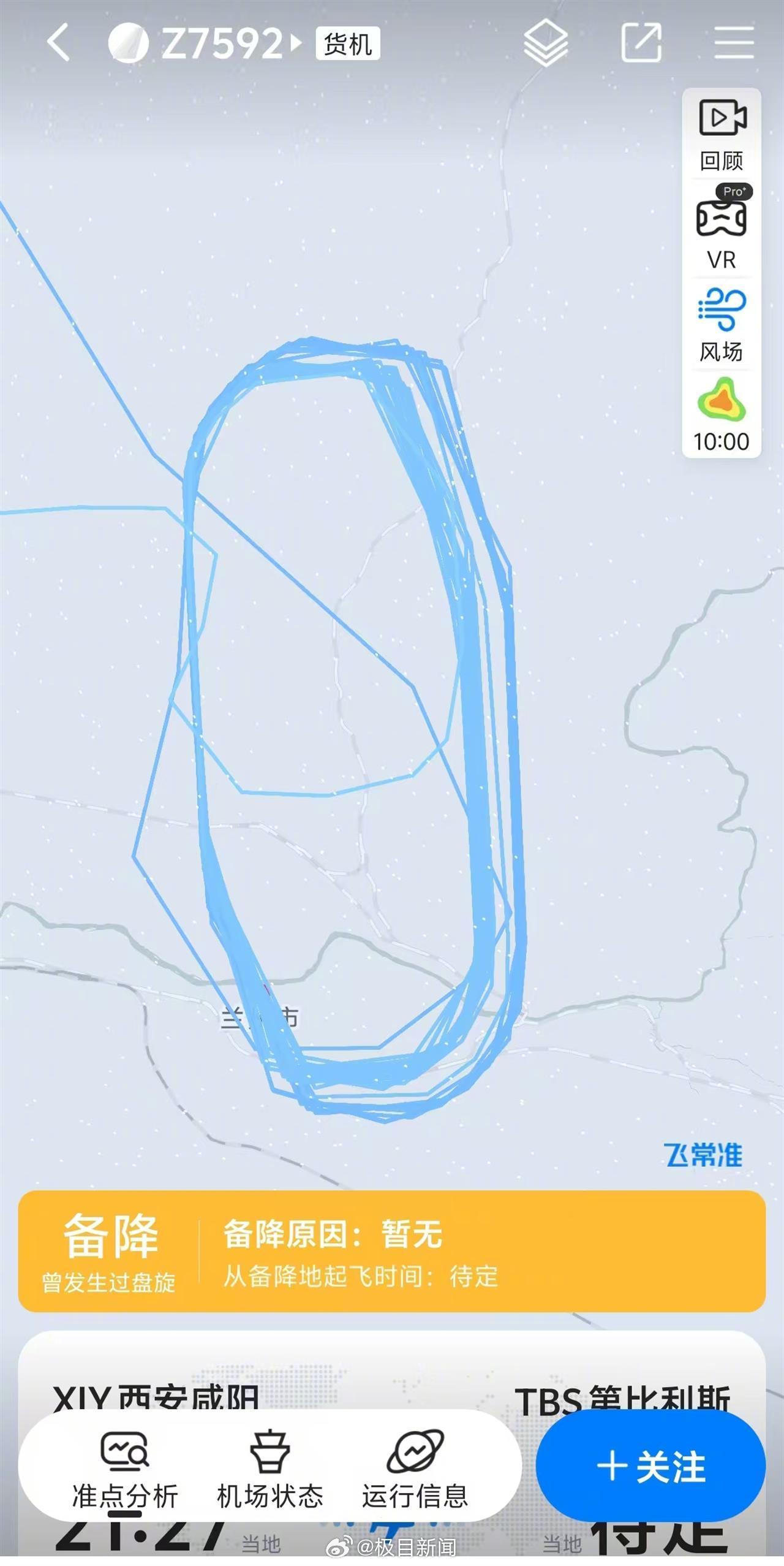 据飞常准app信息,由西安咸阳机场(XIY)飞往第比利斯(TBS)货机Z7592,计划12月15日21时15分起飞,实际于21时27分起飞;原计划12月16日0时57分抵达,当前抵达时间待定。该航班在飞行中于2时47分备降至兰州中川机场,备降原因暂无,从备降地起飞的时间也处于“待定”状态,根据该航班行驶轨迹,飞机在兰州上空盘旋了二十余圈。